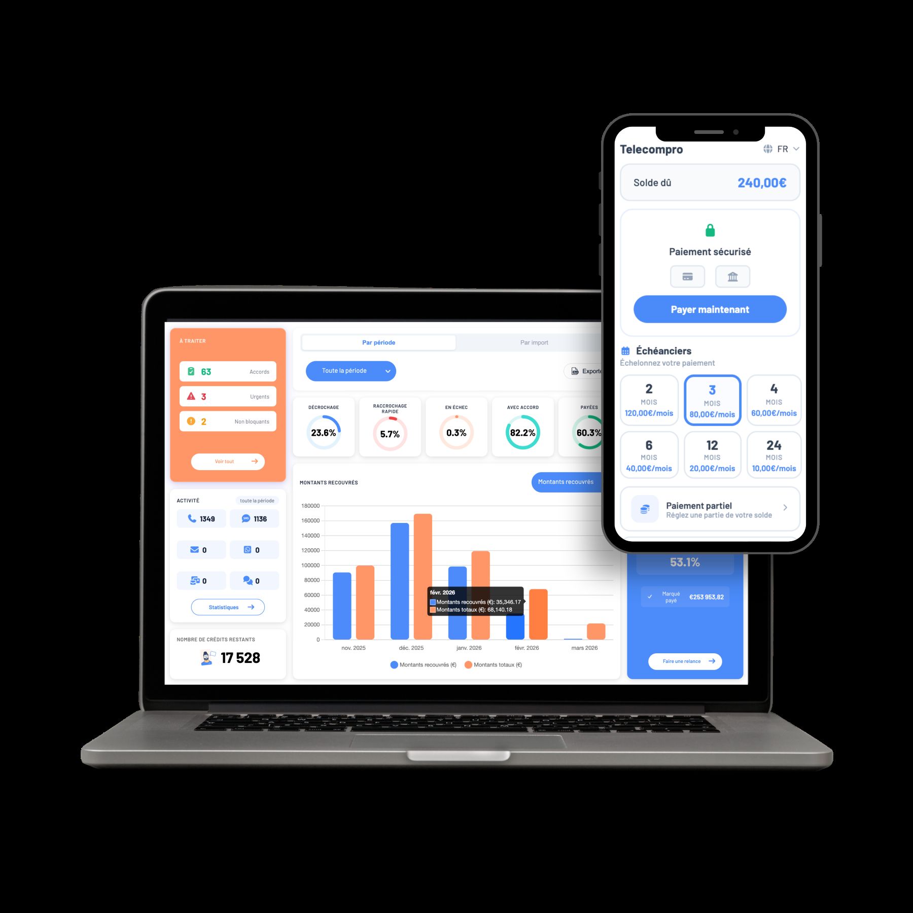Suivi en temps réel : transcriptions des appels, taux de recouvrement par client, montants récupérés. Tout piloté depuis une seule interface. 42% Taux de recouvrement sans intervention humaine, 6,4x ROI constaté, x4 Efficacité post-appel IA, <1% Raccrochage,